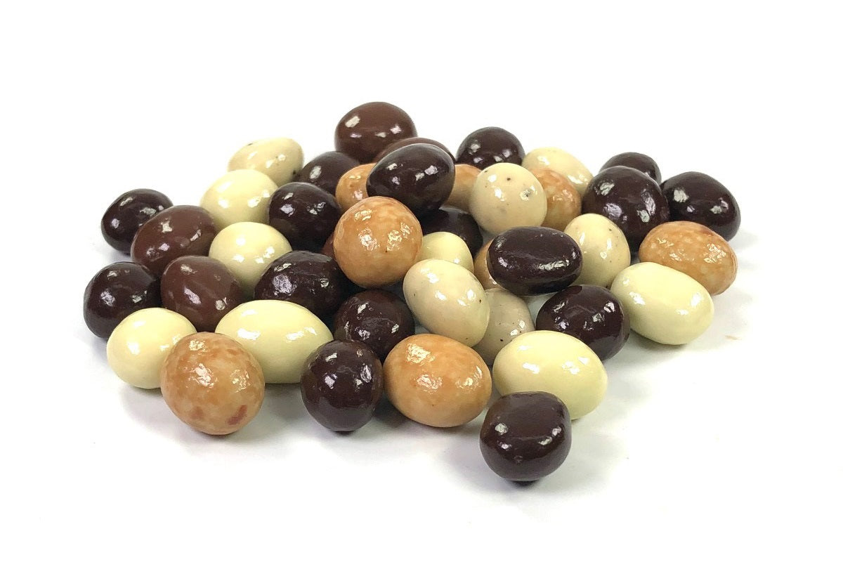 A variety of milk and dark chocolate covered peanuts, almonds, raisins, caramels, toffee, and vanilla cream.